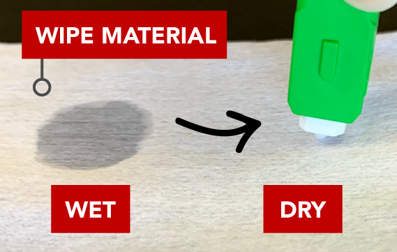 1. Place a dime-sized drop of solvent on the wipe, and then lightly draw in a straight line from the solvent over the dry wipe, removing the soils and drying the end face in one motion.