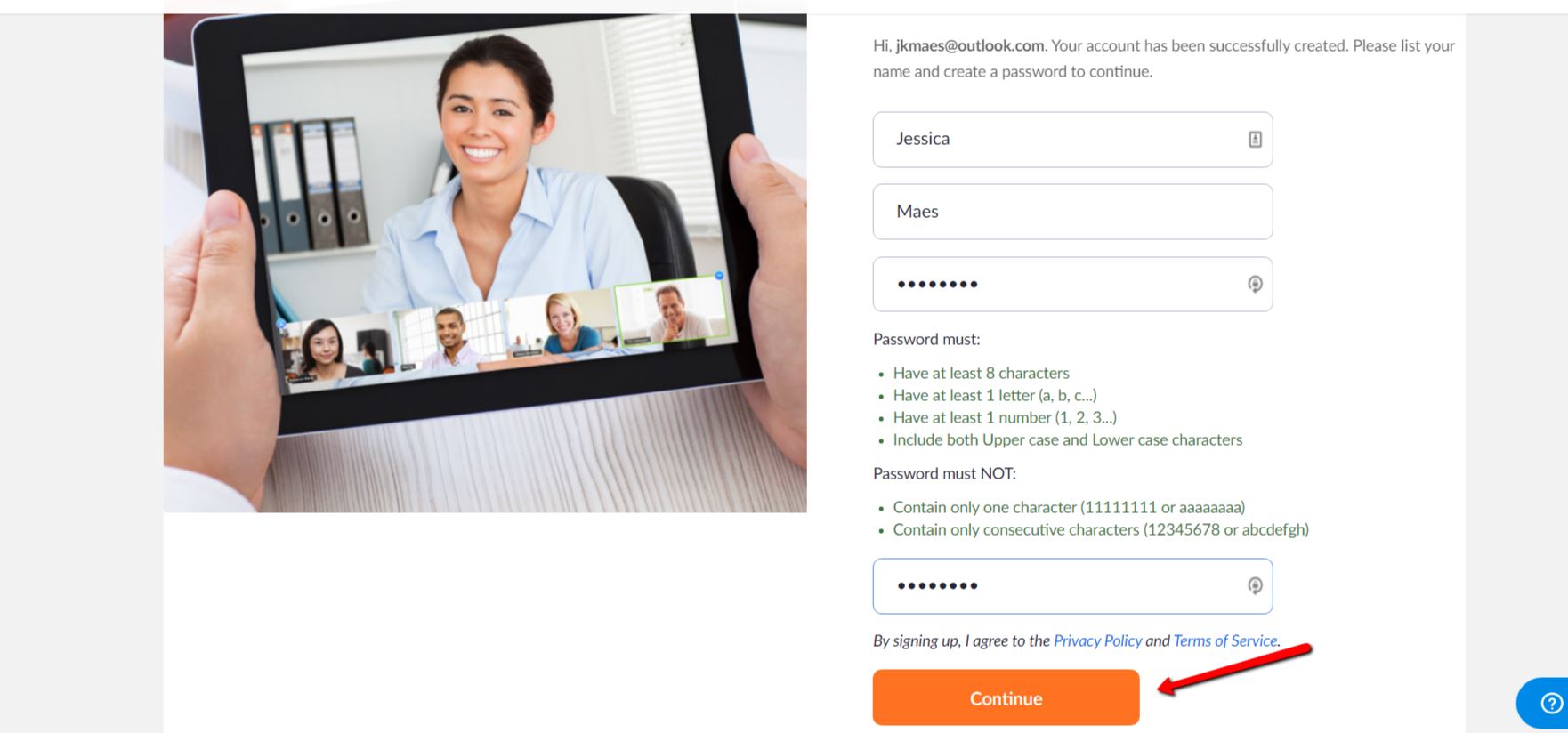 Once you click on the “Activate Account” button in the email referenced above, you will be logged in to your new Zoom account. You will land on this screen where you need to enter your name and password you want to use when you log in to Zoom: