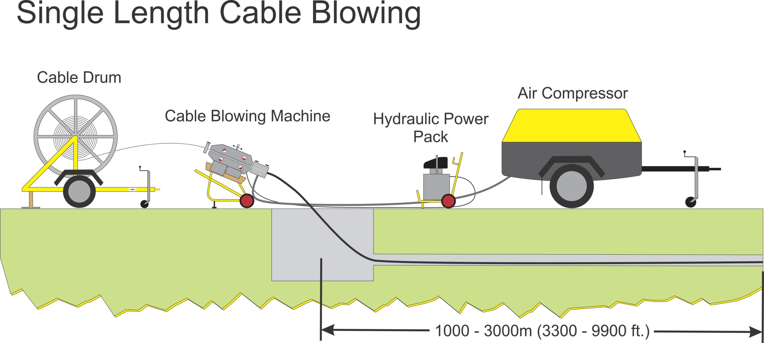 After your duct is proofed and your crash test is performed, you will begin to prepare your fiber. A cable grip should be attached to the end of the fiber as well as a carrier or parachute, sized accordingly. This allows the compressed air to push the parachute through the conduit while the carrier then pulls the attached fiber. Blowing lube should be applied to the opening of the duct before the fiber starts as well as to the fiber as it enters into the duct. After the fiber is properly prepared, it should be pushed into the duct a few hundred feet using the tracks on the machine without having the air compressor on. At least one person is needed to watch the machine and the gauges for proper operation and then a second person to watch the fiber to make sure it is coming off the reel properly and then receive it once it is near the end of the run. After making sure the machine is running smoothly, and the fiber is in a couple of hundred feet, the air compressor should be turned on for the remainder of the installation. An experienced crew can blow nearly 2-3 miles of fiber in a few hours.