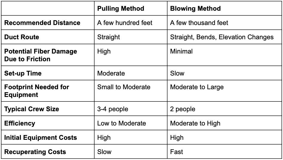 There are several considerations when choosing which method of fiber installation to use. Both methods can be used indoors and outdoors but pulling is a better option for shorter distances while blowing is better for longer distances due to potential friction damage. Furthermore, when pulling the run should be fairly straight with little elevation gain/loss. Blowing fiber is better for runs with bends and elevation changes but needs a larger setup area for the equipment. Purchasing equipment for both methods will have large upfront costs and may not be as important to the decision of which method to choose as the other factors. A crew’s knowledge base and existing procedures or a customer’s special requirements may also determine which method to use.
