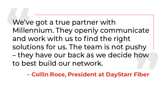 “We’re always open to learning how we can improve our network and service for our subscribers, so we keep our lines of communication open with Millennium and welcome discussions on the latest products and broadband solutions that are available. These conversations help us meet our goal of upgrading service as we expand our network.” – Jared, Outside Plant Manager at DayStarr Fiber
