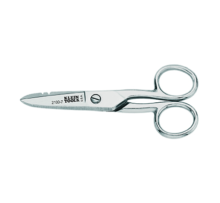 Electrician’s Scissors, with one blade that has a serrated edge that holds wire in place for cleaner cuts. Price per each.