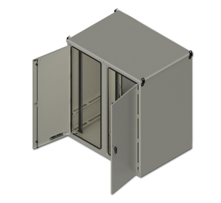 Cabinet, Base Unit, Dual Bay Enclosure, 68″ H x 60″ W x 42″ D, 72RU, 19/23″ Rack Mounting, NEMA 3 Beige Aluminum Shell .125″, S/S lifting hooks, Exterior Solar shield roof, Front and Rear doors with 3 pt SS latching system and pad lockable door handles, Doors with SS wind guard stops, 20 AMP Quad Receptacle, Lifting Brackets, UL Listed. Price Per Each.